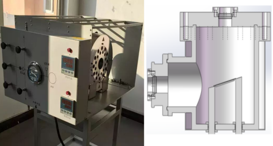 可視觀察金屬燃燒測試系統,燃燒釜設計為釜體和釜蓋,釜體側壁開設兩個觀察窗口,架設紅外熱像儀和高速相機。紅外攝像儀和攝像頭通過視窗觀察燃燒實驗的進行情況,并把數據傳輸到觀察控制室內。釜體側面開有進氣口排氣口真空口泄壓口,反應釜內徑為150mm,內深203mm,材質選用304不銹鋼制作,內表面鍍銅。釜體為雙層水套結構,耐壓10MPa,漏率:<5×10-8Pam3/s。